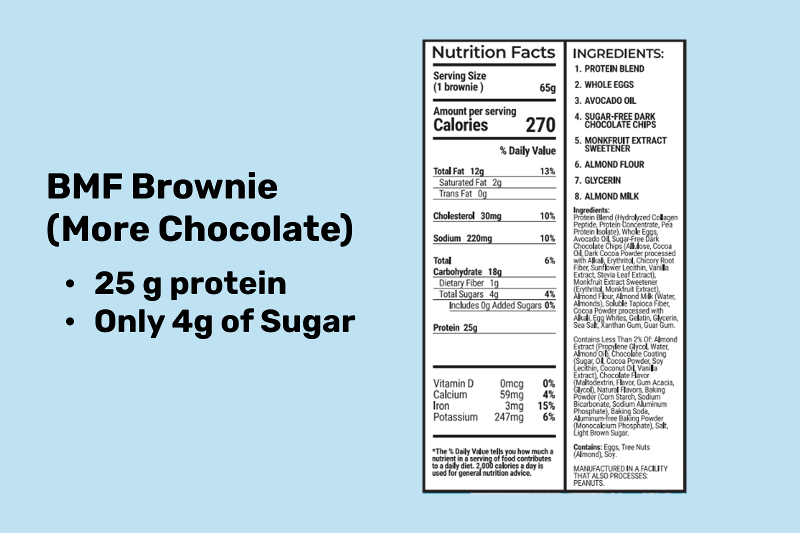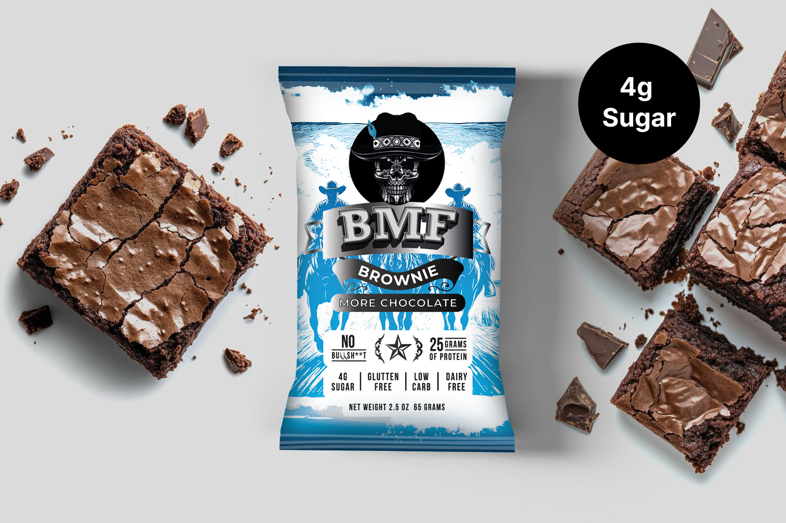 Each 65g BMF Brownie delivers 25 grams of protein, 1g of sugar, and clean, functional ingredients — no artificial colors, flavors, or preservatives. Gluten-free, low carb, dairy-free, and made with real foods like avocado oil and almond flour. A legit treat that fuels your day without the junk.